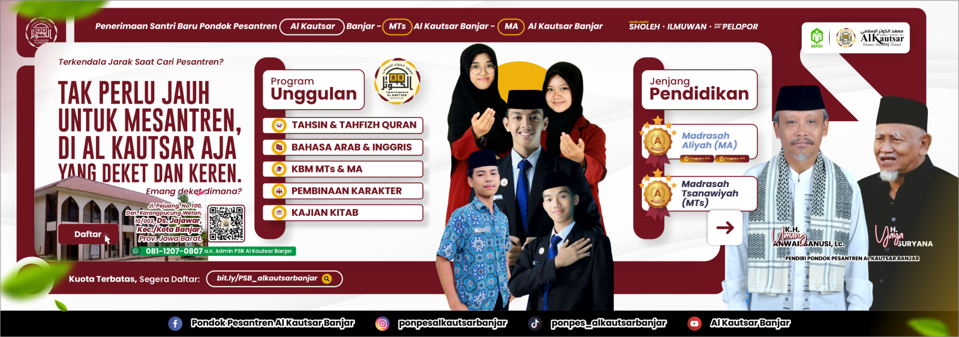 Berdiri di atas tanah wakaf sejak 1995, Pondok Pesantren Al Kautsar Banjar memadukan kurikulum pesantren (Tahsin, Tahfizh, Bahasa Arab-Inggris) dengan pendidikan formal (MTs & MA). Kami berkomitmen melahirkan lulusan yang tidak hanya hafal Al Quran, tetapi juga menguasai IPTEK dan siap bersaing di kancah global.